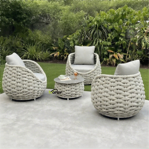 4.रोप आउटडोअर सोफा: हाताने बांधलेली दोरीची रचना दृष्यदृष्ट्या हलकी आणि श्वास घेण्यायोग्य आहे आणि ॲल्युमिनियम फ्रेम आधुनिक स्पर्श देते. आराम आणि कलात्मकता एकत्र करून, अत्याधुनिक बाल्कनी तयार करण्यासाठी ही एक लोकप्रिय निवड आहे.